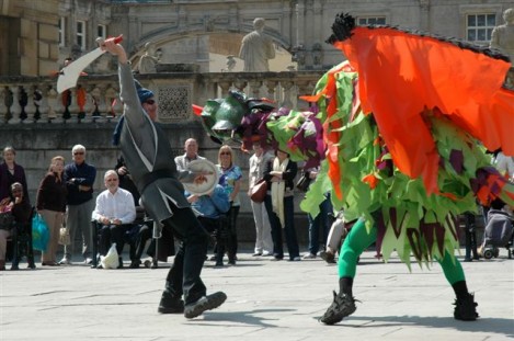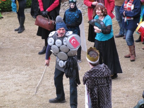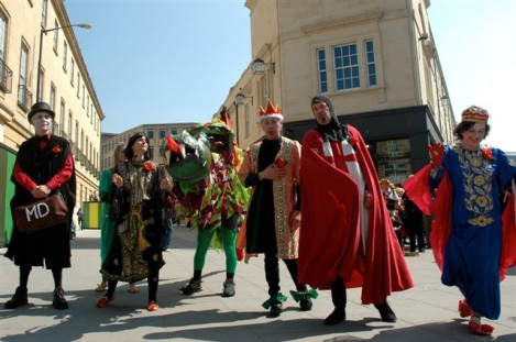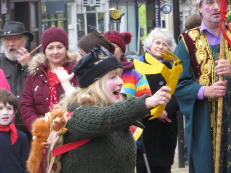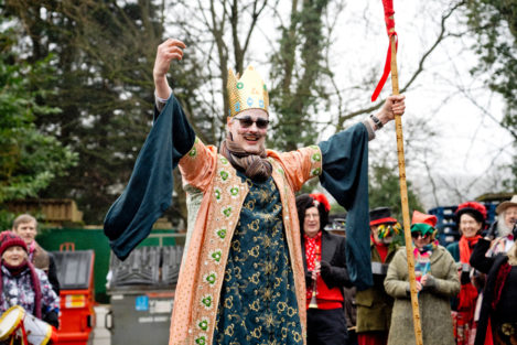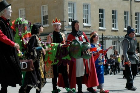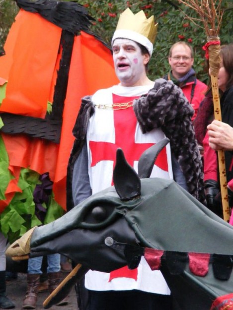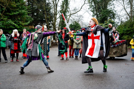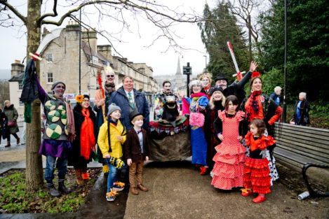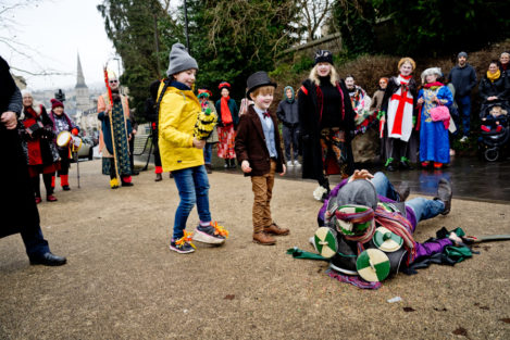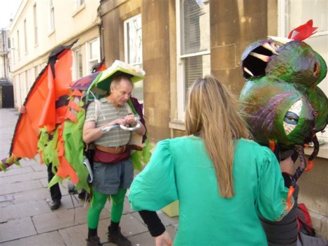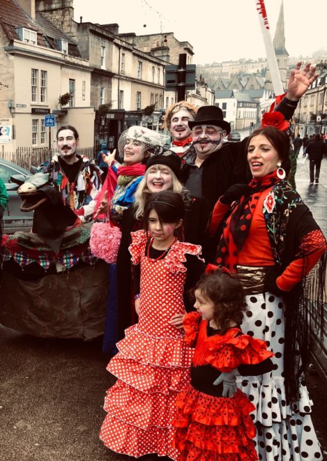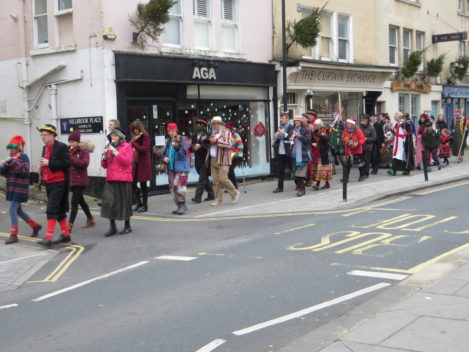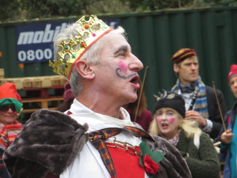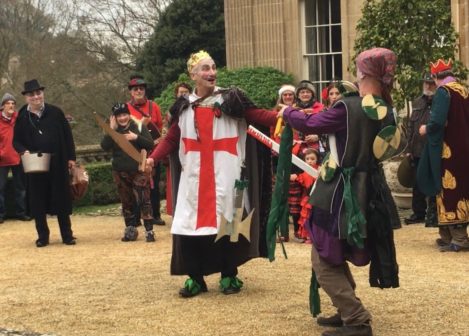 Think of it as street pantomine with a 300-year history. There is a traditional story with traditional characters but no fixed script, and indeed every mummers group takes pride in creating its own tradition. Once upon a time mummers groups existed in villages the length and breadth of the country. Many groups died out after World War I, but there are still many groups active. Locally they can be found at Marshfield and Keynsham as well as Widcombe. (The other Bath group, Weston Mummers, had a rest this year.)