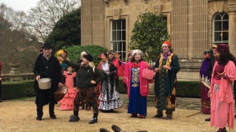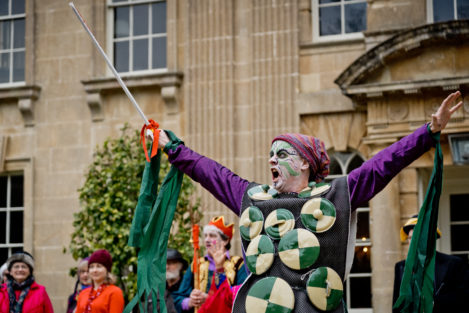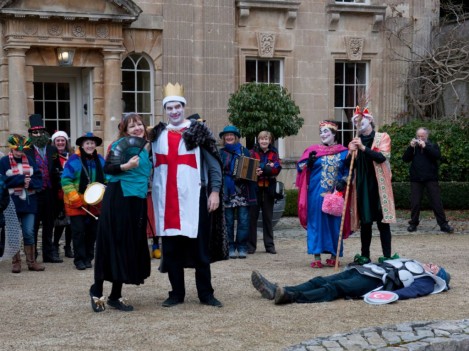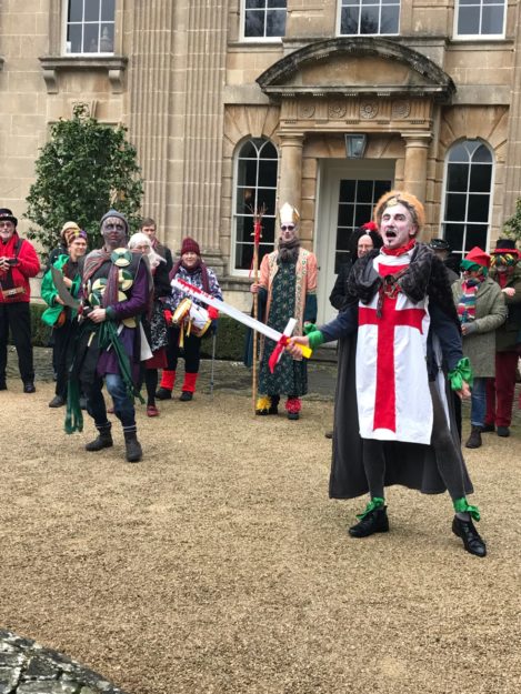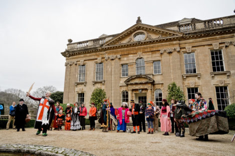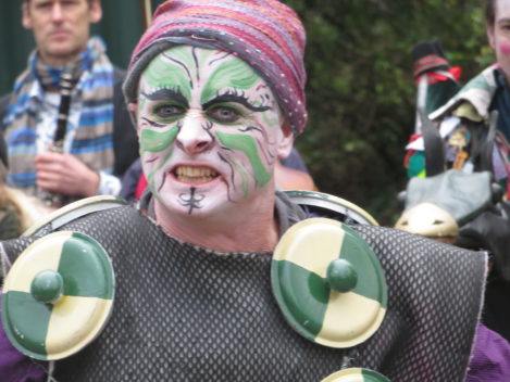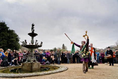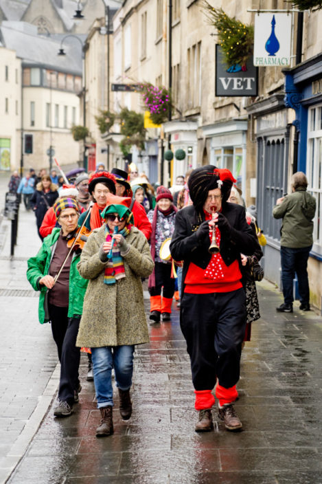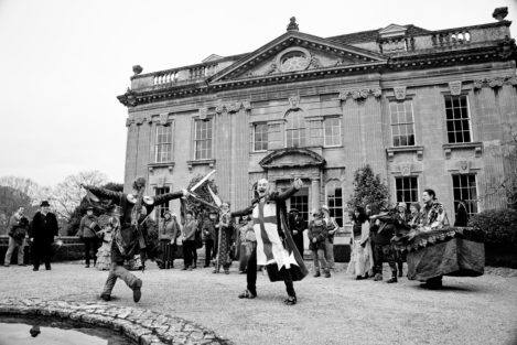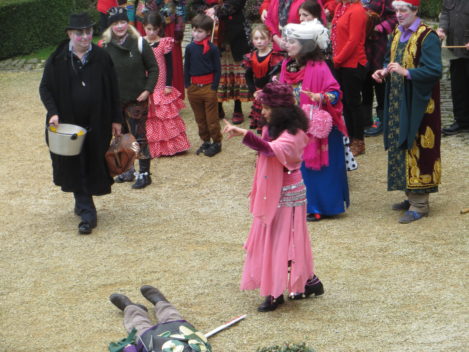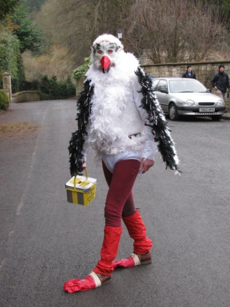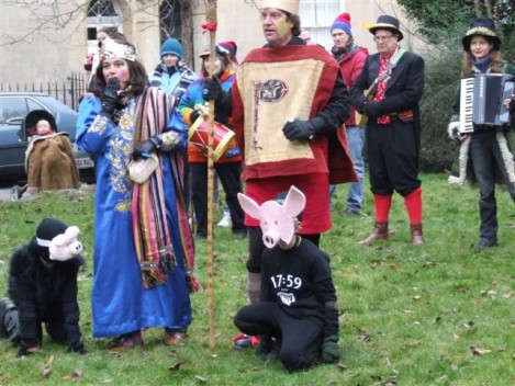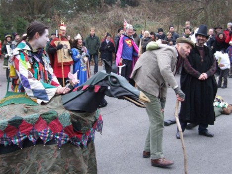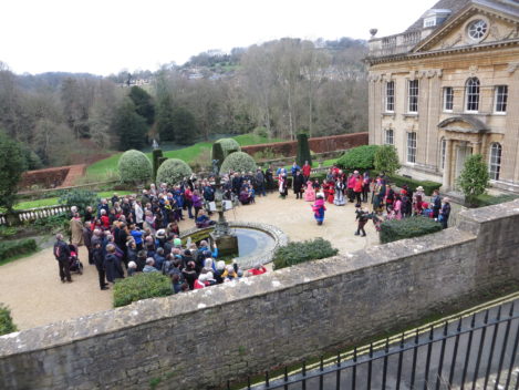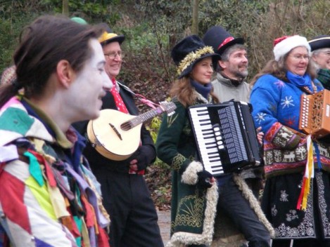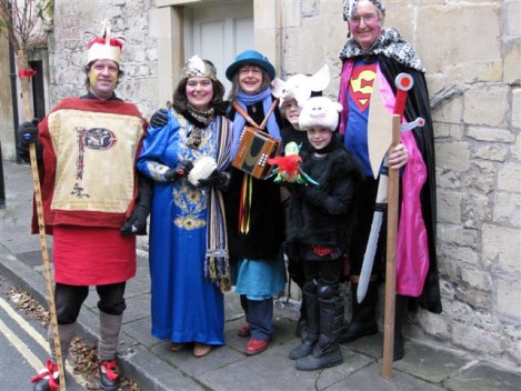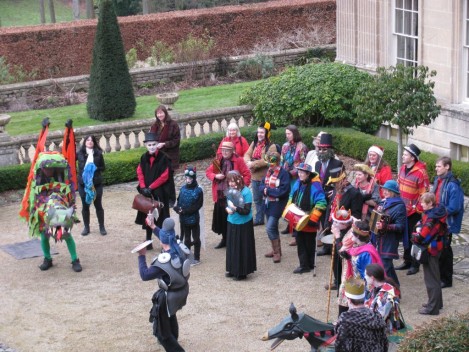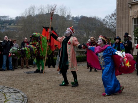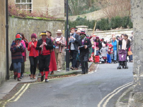 Performances are held on New Year’s Day starting from St Thomas’ Church at noon. Performance venues are (depending on circumstances) Widcombe Manor, Widcombe Crescent , and Prior Park Garden Centre. The players process from place to place preceded by musicians playing tunes carefully chosen to stir the blood and ward off evil weather. Each performance lasts about 8 minutes and ends with a song This year (2010) we premiered the brand-new Song for Widcombe: Widcombe you’re a Jewel.